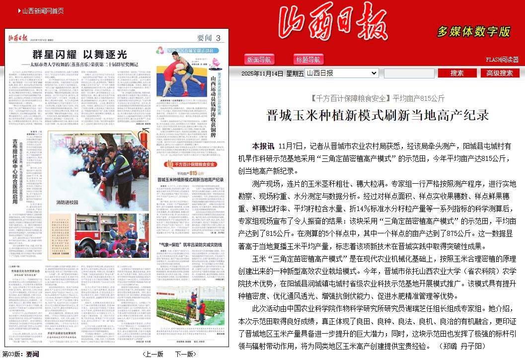 11月14日山西日报报道晋城市谷子玉米有机旱作科研示范基地采用“三角定苗密植高产模式”种植的玉米示范田,今年平均亩产达815公斤,创当地高产新纪录。