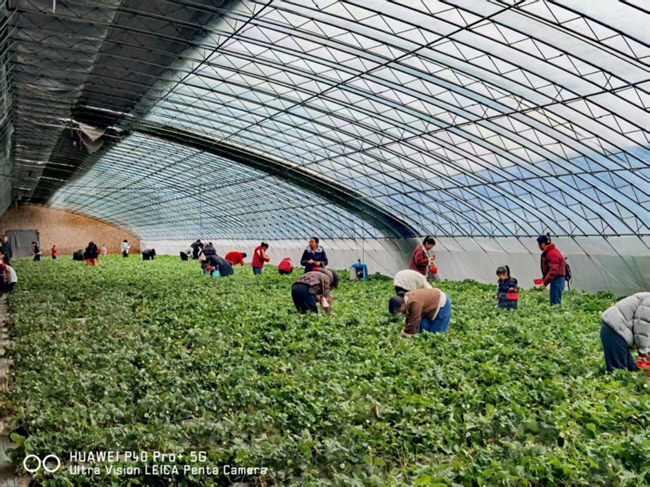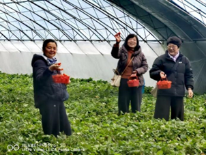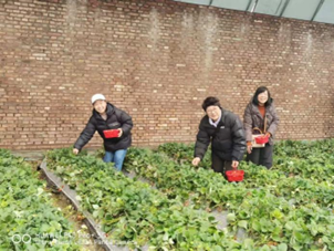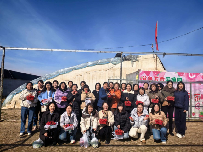 随后,大家前往位于采摘园。下车后,蓝天白云下,一座座温室大棚整齐排列,红彤彤的横幅与草莓图案相映成趣,“兴农筑梦绽风采 巾帼撷趣庆佳节”的字样格外醒目,瞬间点燃了大家的参与热情。