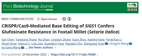 2025年12月24日,山西农业大学农学院谷子产业化技术创新团队在Plant Biotechnology Journal上发表题为“CRISPR/Cas9-Mediated Base Editing of SiGS1 Confers Glufosinate Resistance in Foxtail Millet (Setaria italica)”的研究论文。在本研究中,通过腺嘌呤碱基编辑器(ABE8e)对 SiGS1 基因进行精确编辑,成功产生了 S59G-T60A(SGTA)突变,同时编辑植株对草铵膦表现出稳定的抗性。