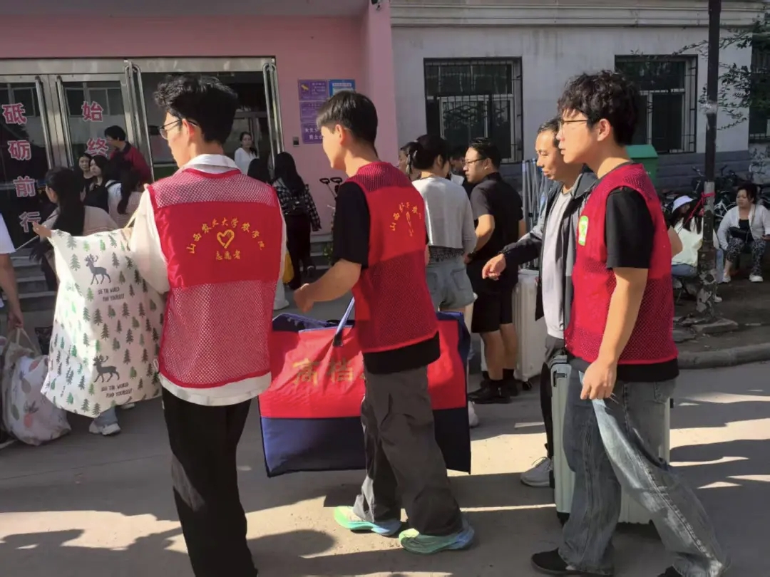 今年我院迎新点设置于西门、15号与17号学生公寓楼前,现场随处可见醒目的迎新指引牌、温暖的欢迎标语。身着红色马甲的志愿者们早已守候在各迎新点位,他们以饱满的热情和细致的服务,为每一位新生提供贴心帮助:从答疑解惑、指引路线,到协助办理入住、搬运行李,用行动传递着温暖与关怀。