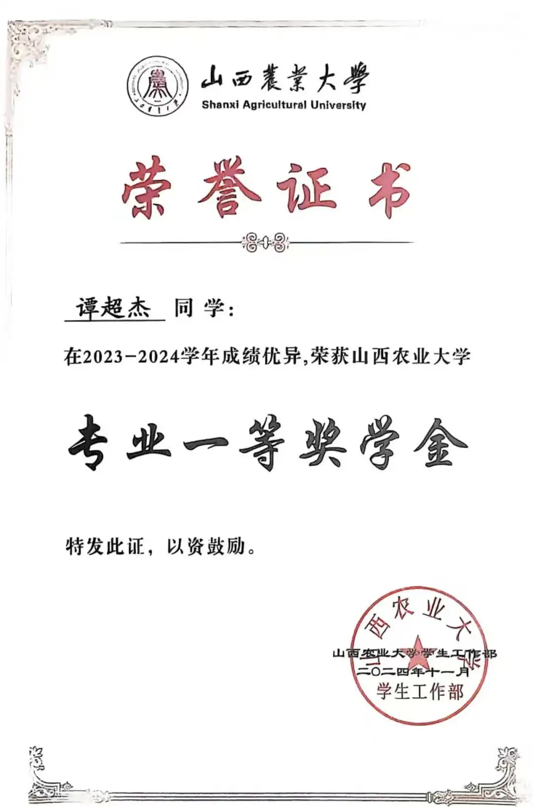转眼间,大学时光已走过三年半。回望过去,没有惊天动地的成就,却满是脚踏实地的成长;展望未来,我希望能把课堂上学到的理论知识,真正用到田间地头的实践中,读懂每一寸土地的需求,成为懂农、爱农、兴农的践行者。今天,我因山西农大而自豪;期待多年后,山西农大能因我而骄傲。获奖感言:我非常荣幸能够获得国家励志奖学金,同时我也十分感谢国家设立这一奖学金,它不仅是对我学业成绩的肯定更是对我未来发展的鼓励。在这个充满机遇与挑战的时代,这份荣誉对我来说,意义非凡。未来的日子里我将不忘初心,继续努力学习,提升自己的综合素质,希望通过自己的努力回馈社会,帮助更多需要帮助的人。