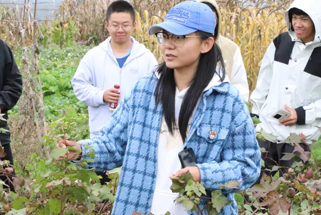 活动中,“草帽知行”团队聚焦蓖麻、棉花、西红柿、辣椒、花生、柽麻6种特色作物,由团队指导老师崔福柱及实践队员丁乐、赵苑均、郭昭棋、余闵夙、陈佳慧分别展开专题讲解。讲解人员围绕作物种植技术、生长周期管理、多元用途等方面,为在场同学进行系统性科普。