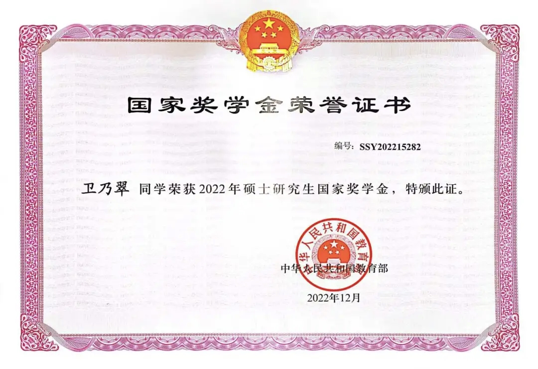 国家奖学金,承载着国家对研究生潜心科研、勇攀高峰的鼓励与殷切期望。这份荣誉于我,是一份沉甸甸的认可,更是前行路上的莫大动力。在此,衷心感谢学校与学院,为我们搭建了先进的科研平台,提供了丰富的学术资源,更营造了浓厚的学术氛围,让我们得以心无旁骛探索未知。特别感恩我的导师郑军研究员与王娟玲研究员,两位老师始终给予我悉心的支持、温暖的鼓励与无私的关爱。他们精益求精的工作态度、严谨务实的科研作风,早已深深影响着我,让我在科研道路上受益匪浅。成果属于过去,未来征途漫漫,我将步履不停、矢志笃行,带着这份认可与期许,继续奔赴更远的远方。