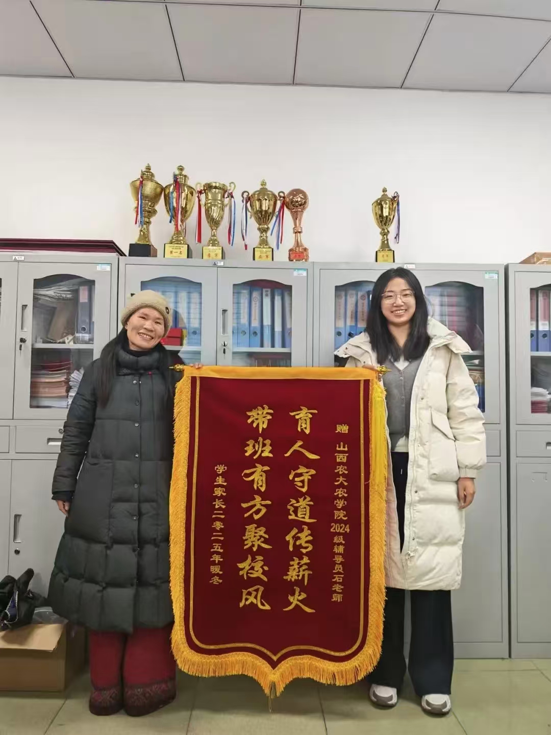冬日初雪,校园银装素裹。我院辅导员石佳凝收到了一份特殊的“冬日暖礼”——一面写有“育人守道传薪火 带班有方聚校风”的锦旗和一把题满赞诗的折扇。这份来自学生家长的谢礼,藏着一个始于细微、成于信任的温暖故事。