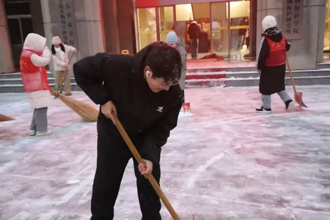 尽管冬日寒风凛冽,气温偏低,但青年志愿者们热情不减。大家手持铁锹、扫帚等工具,分工明确、相互配合,有的铲雪破冰,有的清扫路面积雪,有的转运雪堆,齐心协力对主楼门前的路面进行了全面清理。他们劳动的身影穿梭在漫天飞雪中,构成了一道冬日里温暖的风景线。