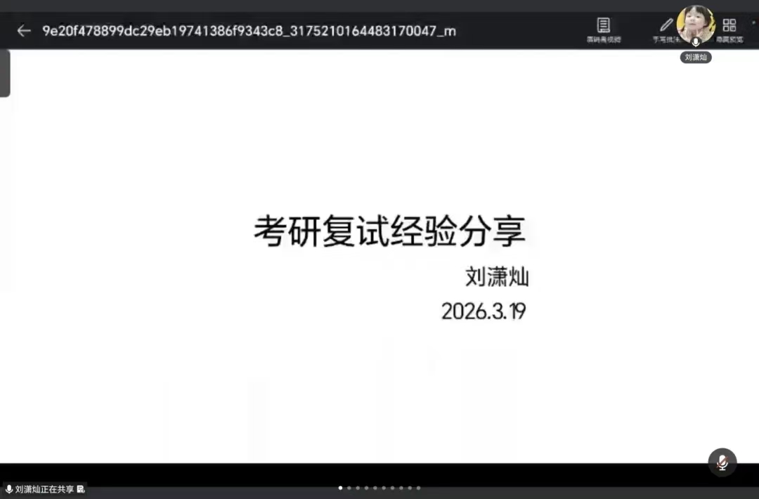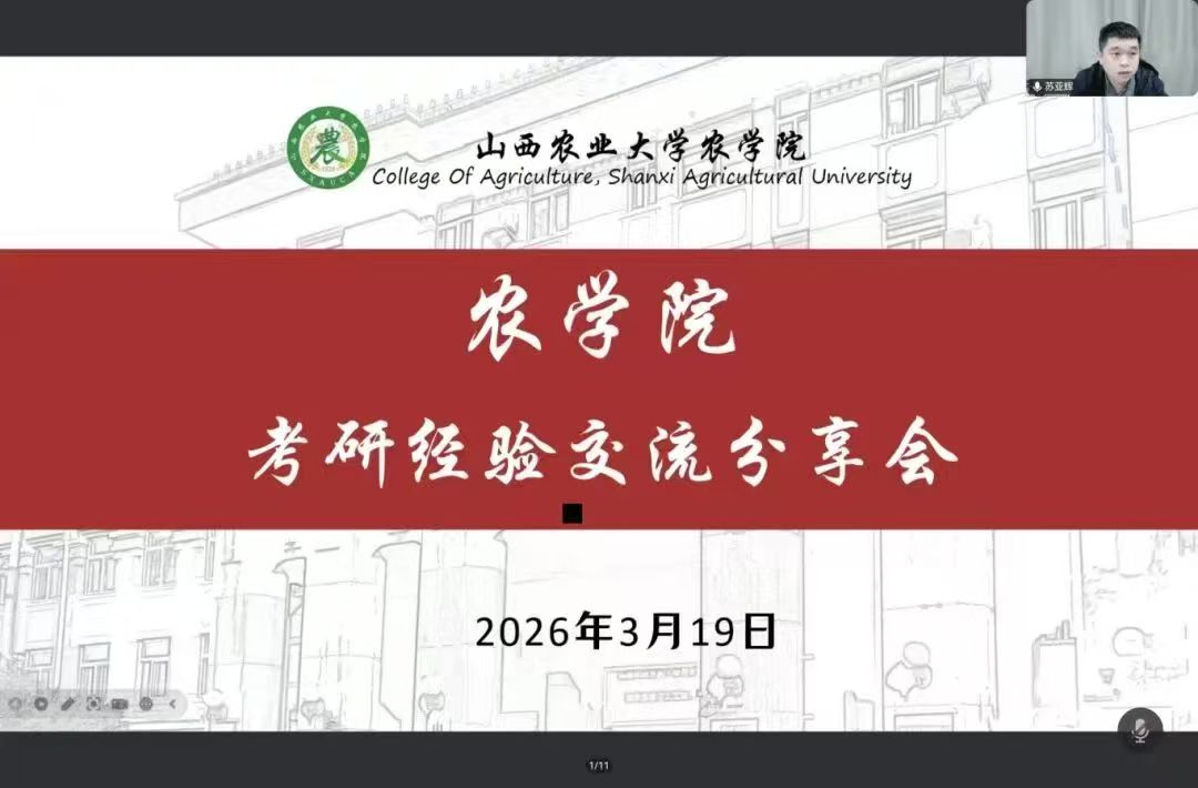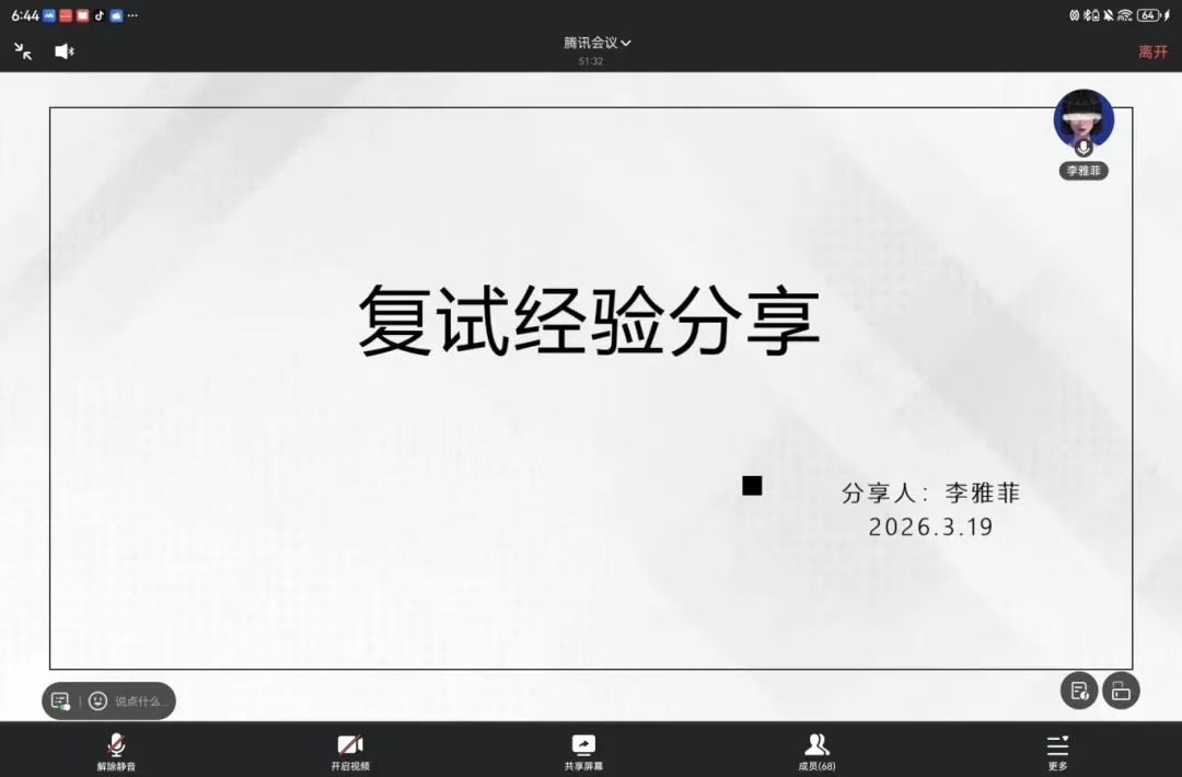 为充分发挥优秀学子的引领作用,有效提升2026届考研学子的综合素养与复试应对能力,3月19日,我院采取线上会议的形式举办了2026届考研复试经验分享会。本次会议由辅导员苏亚辉主持,特邀八位来自不同高校的优秀毕业生担任主讲嘉宾,分享经验,2026届全体考研学子参加会议。