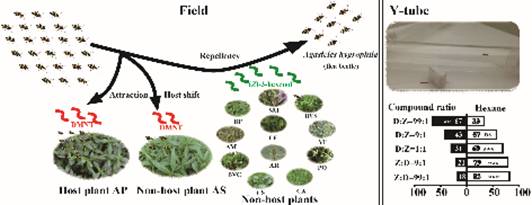 引进天敌是否发生寄主转移是评价入侵杂草生物防治效果的一项重要标准。近年来生防作用物攻击非靶标物生态事件频发,而在寄主转移过程中,引起植食性昆虫选择偏好性的第一步——嗅觉作用研究鲜见。本研究以单食性昆虫莲草直胸跳甲(Agasicles hygrophila)——入侵生物喜旱莲子草(Alternanthera philoxeroides)为模型,在自然界中选择定位寄主植物和非寄主植物进行研究,明确了莲草直胸跳甲利用寄主植物与非寄主植物挥发的物质特异性比例来寻找定位寄主植物;阐释了自然界中单食性昆虫定位寄主的嗅觉识别机制,这种机制暗示了在生物防治过程中可能会有寄主转移的风险。该项研究有利于今后生物防治领域中寄主专一性测定的理论与实践,有助于阐明昆虫与植物之间的协同进化关系,对生物防治与生态安全具有较好的前瞻意义。